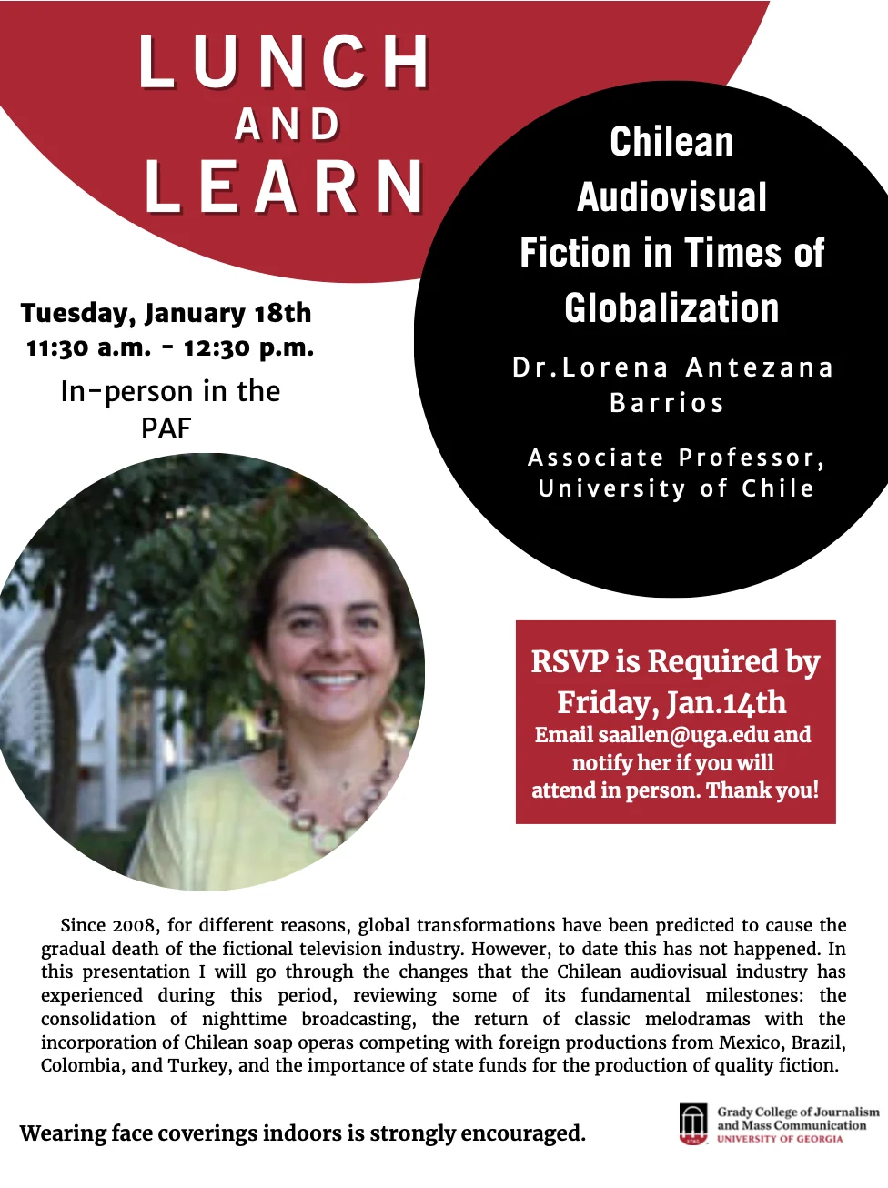 Lorena Antezana Barrios, associate professor from University of Chile, lead this lunch and learn. The title of the discussion is: “Chilean Audiovisual Fiction in Times of Globalization.”