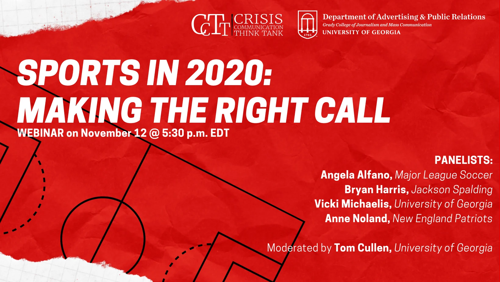 The UGA Crisis Communication Think Tank is hosting the webinar, “Sports in 2020: Making the Right Call,” on Thursday, Nov. 12 at 5:30 p.m. Register for this free event to hear from Angela Alfano (ABJ ’10) from Major League Soccer, Bryan Harris (MA ’03) from Jackson Spalding, Vicki Michaelis, Carmical Chair in Sports Media and Society, and Anne Noland (ABJ ’15), from the New England Patriots, about how sporting events and teams are functioning this year. The webinar will be moderated by public relations instructor Tom Cullen.