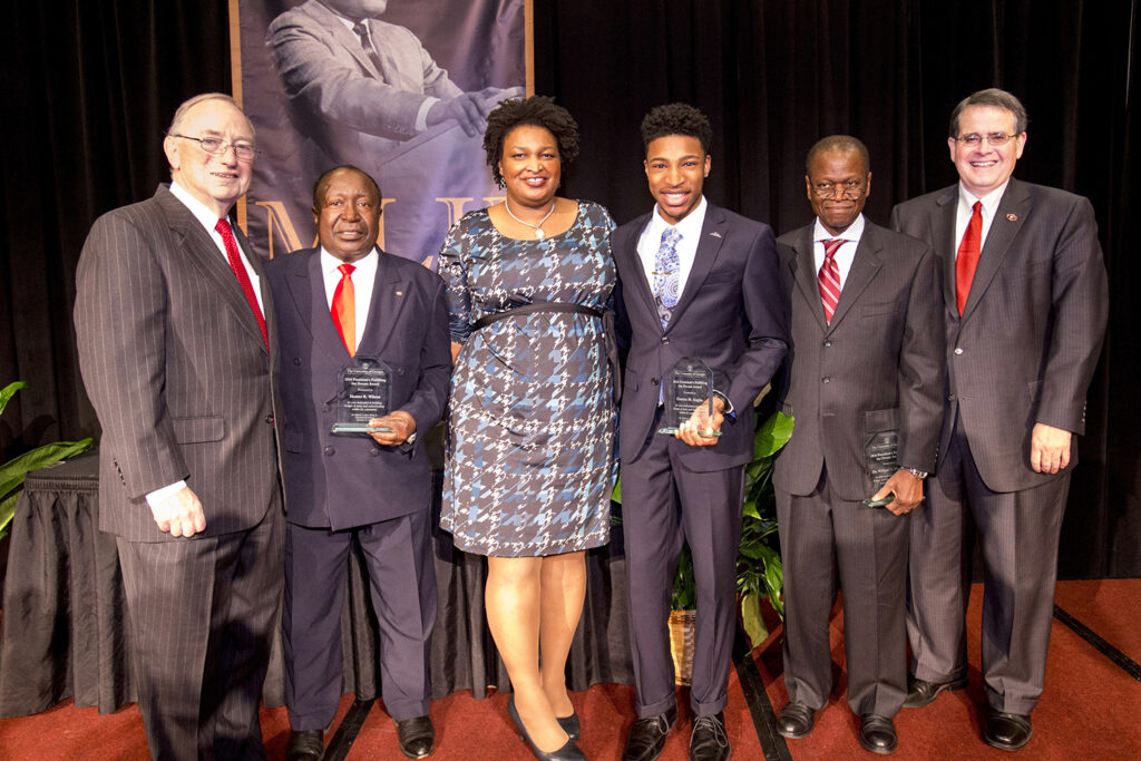 University System of Georgia Chancellor Hank Huckaby (left), Stacey Abrams (center, blue dress) and UGA President Jere W. Morehead (right) congratulate recipients of the 2016 President’s Fulfilling the Dream Award: Homer Wilson (second from left), Darren Anglin (third from right) and William Kisaalita (second from right). Photo/Dorothy Kozlowski.