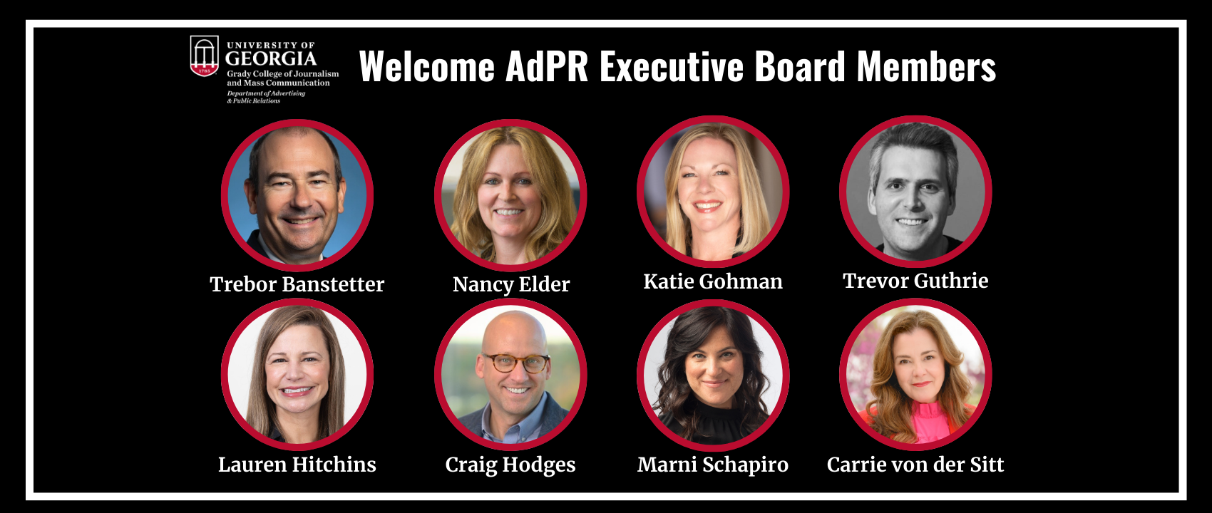 The Department of Advertising and Public Relations proudly welcomes eight new members to its Executive Advisory Board: Trebor Banstetter, Nancy Elder, Katie Gohman, Trevor Guthrie, Lauren Hitchins, Craig Hodges, Marni Schapiro and Carrie von der Sitt.