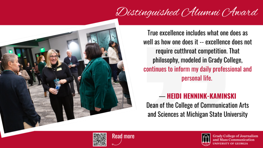 I received top-notch research training in the doctoral program, but it’s Grady’s culture of encouragement and support that has had the most profound influence on my career as a scholar and leader. The academy typically celebrates and rewards faculty for their individual expertise and reputation. This can lead to “me-ness”, not “we-ness”. At Grady, however, I experienced firsthand the uplifting energy of a collaborative, supportive culture – among the faculty, among the graduate students and in the engagement between faculty and graduate students. True excellence includes what one does as well as how one does it — excellence does not require cutthroat competition. That philosophy, modeled in Grady College, continues to inform my daily professional and personal life.