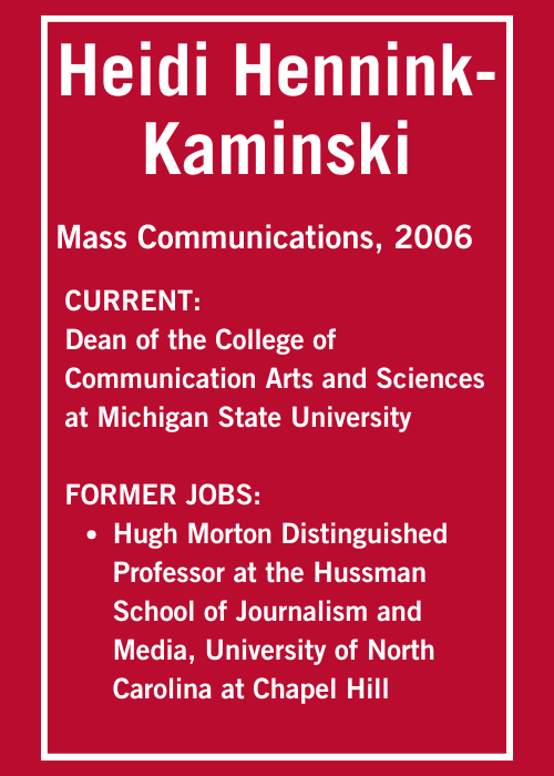 Hennink-Kaminski’s research focuses on interdisciplinary health communication, emphasizing social marketing strategies to promote healthy behaviors at both individual and community levels. Her research has been funded by the Centers for Disease Control and Prevention, the National Institutes of Health and the Doris Duke Charitable Foundation, among others. Before joining Michigan State University in 2024, Hennink-Kaminski was an 18-year faculty member at the Hussman School of Journalism and Media at the University of North Carolina at Chapel Hill where she was the Hugh Morton Distinguished Professor.