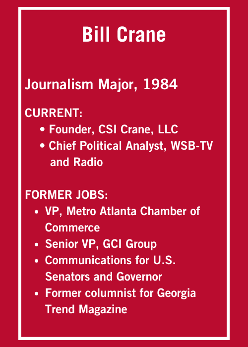 Crane has served as a senior communications strategist for nearly 30 years. He began his career in broadcasting and has worked in that arena as the chief political analyst and commentator for WSB-TV’s Action News and WSB-Radio AM 750, a role he continues today. Crane has also served as a columnist for Georgia Trend magazine and a number of weekly newspapers.