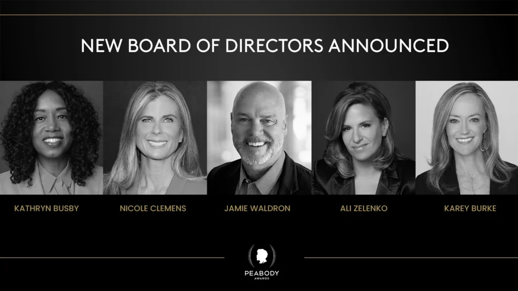 “We are thrilled to welcome Karey, Kathryn, Nicole, Jamie, and Ali, a remarkably accomplished group of story developers and media strategists, to the Peabody Board of Directors” said Jeffrey Jones, executive director of Peabody.  “Alongside the rest of our incredible Board members, we know they will leverage their invaluable wisdom and experience to help us champion the powerful stories and emerging voices. We are also grateful for Bruce’s stellar leadership of the West Coast Board and look forward to having David guiding us through our next chapter.”
