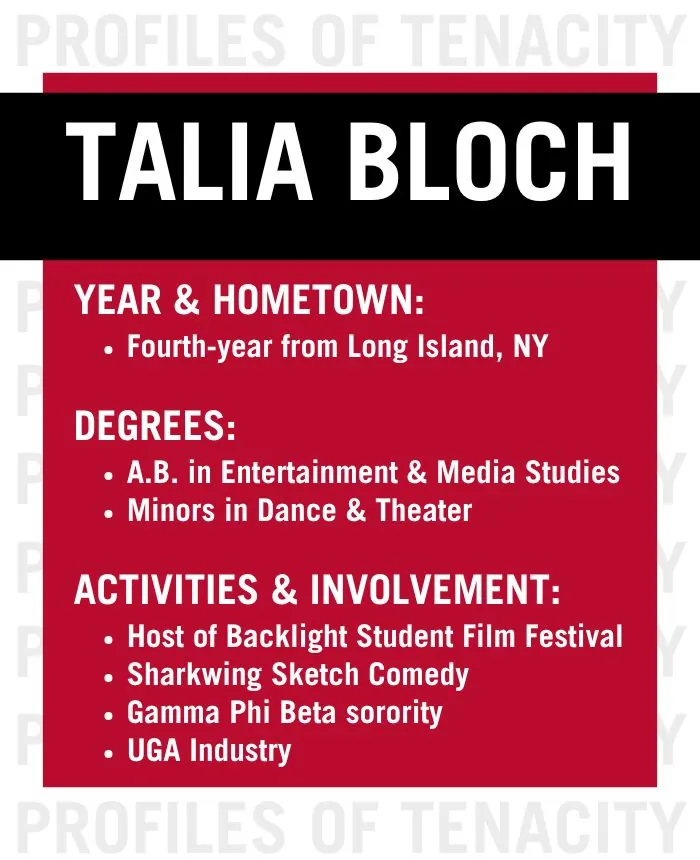 Talia Bloch is a fourth-year entertainment and media studies major from Long Island, NY. With a passion for comedy and creativity, Bloch is co-hosting the fourth-annual Backlight Student Film Festival. She also participates in improv and stand up comedy, along with being a part of Sharkwing Sketch Comedy. Bloch has used her experience as an EMST student to set herself up for success for a career in entertainment and hopes to move to Los Angeles, California, upon graduating in May 2025.