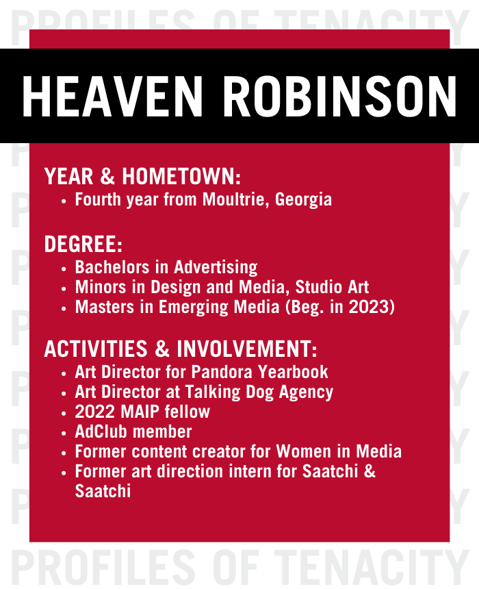 Fourth year advertising major Heaven Robinson uses her design skills both in and out of the classroom, serving as the art director for Pandora Yearbook and Talking Dog Agency. Robinson was a 2022 MAIP fellow, interning for Saatchi & Saatchi this summer. After graduating in December, she will pursue a masters degree in emerging media.